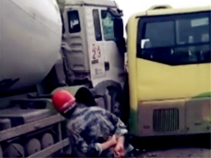 罐车撞上巴士 两车“头尾相咬”