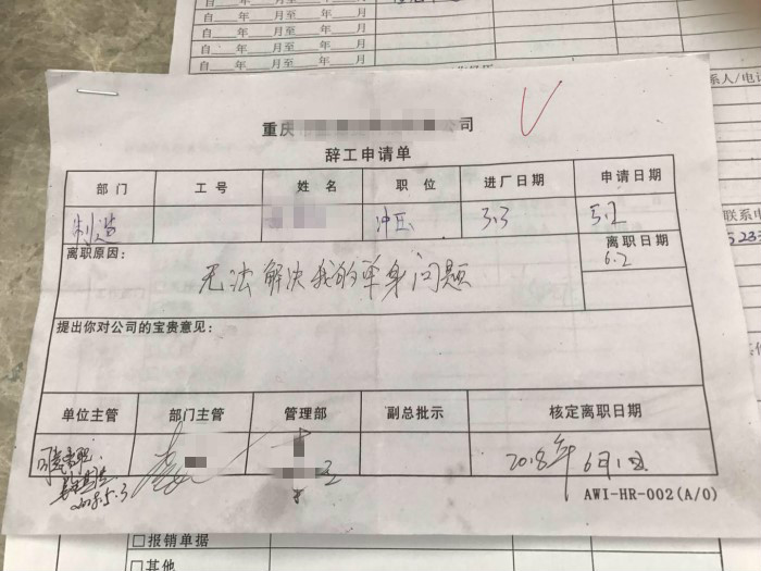 从图片中,我们可以了解到,这位小伙属于制造部门,职位是冲压,入职时间是今年的3月3日。在短短两个月内提出离职,同时也得到了部门主管的同意批准,6月1日已从公司离职。