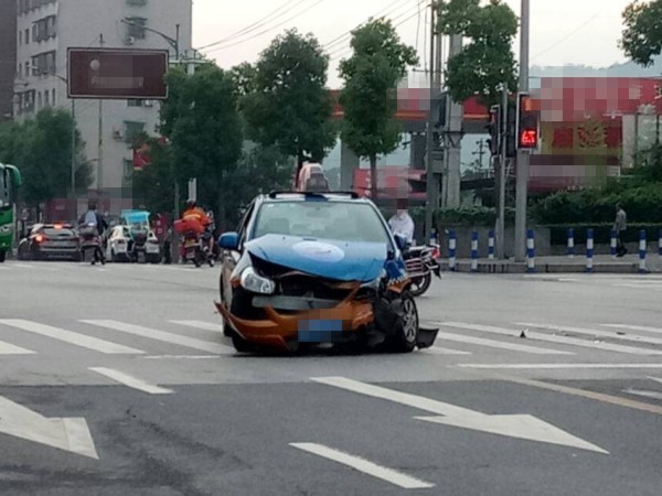 只见出租车停靠在人行道上,车头保险杠脱落,车头发生形变,车身铁皮散落一地,汽车内部零件都清晰可见并有所损坏,可谓是面目全非。