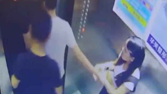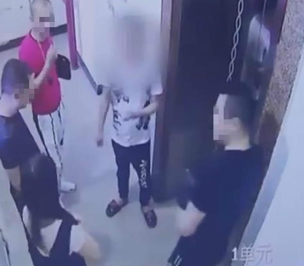 过了一会儿,四名男子相继走出电梯,其中一名白衣服的男子拉了何小姐一下,结果没有将何小姐拉出去。
