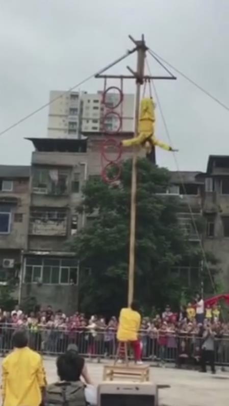 不过到了表演“倒挂金钩”,最为精彩的环节,“孙悟空”悬挂在绳子上保持倒立的姿势,准备起身时,却不小心从10米高的竹竿摔了下来。