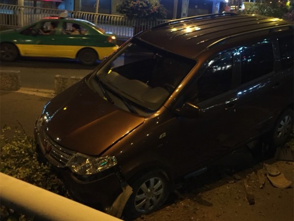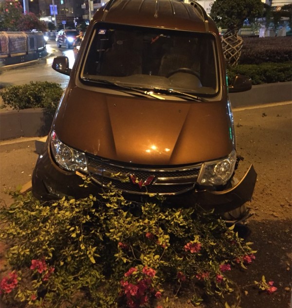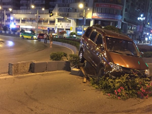 私家车直接飞越花坛 将花草碾压在地
