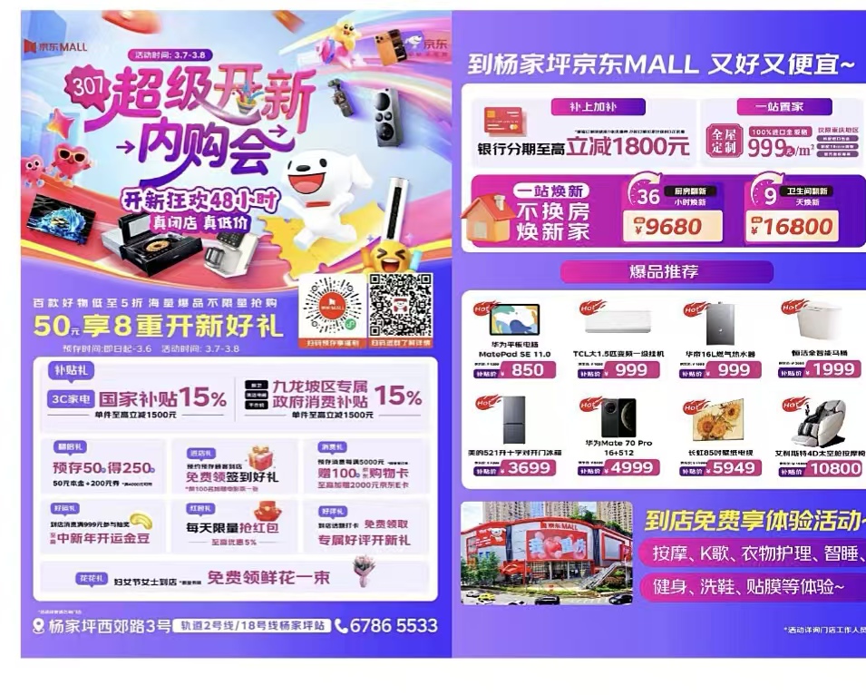 杨家坪京东MALL将于3月7日—3月8日针对家居、家电和手机数码产品,开展15%国补和15%九龙坡区政府消费补,此外还联合厂家、银行,以最低价格提供最优产品,服务市民享受补贴。有需要的居民朋友可前往。