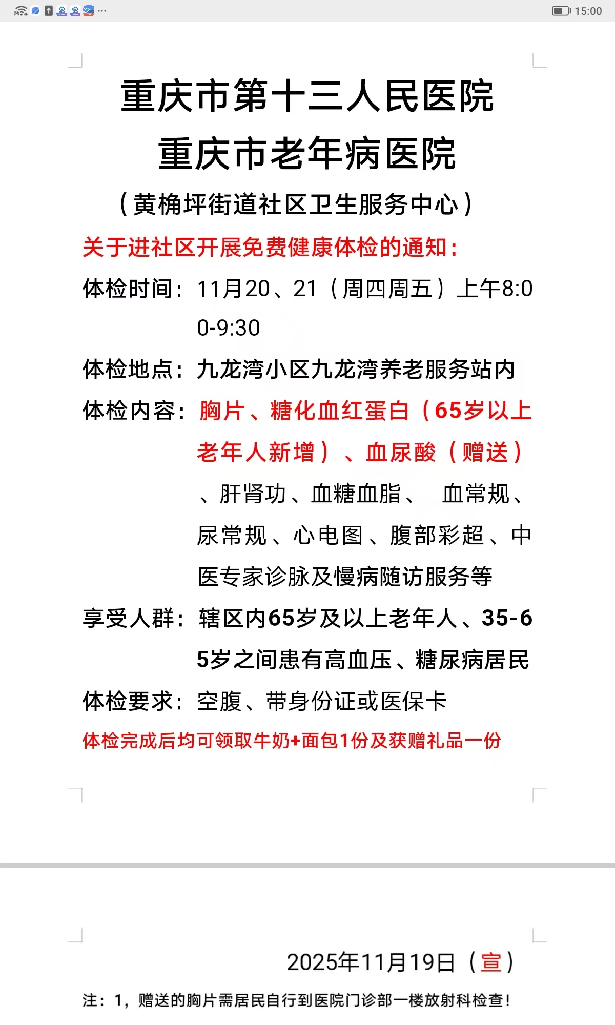 注:1,赠送的胸片需居民自行到医院门诊部一楼放射科检查!