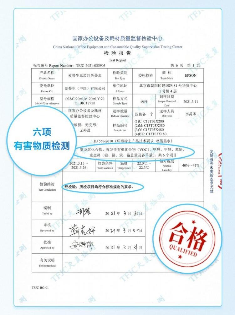 图:爱普生原装正品墨水通过了国内权威机构检测,保障用户使用安全