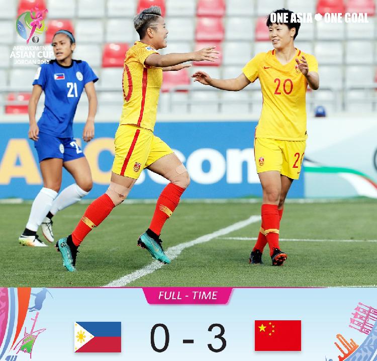 第30分钟,中国队右路传中,菲律宾后卫解围没有顶出禁区,马君迎着来球一脚抽射得手,中国队2:0领先。下半场第55分钟,李影梅开二度为中国队锁定胜局。这也是李影本届亚洲杯打入的第三粒进球。