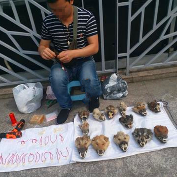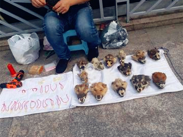 只见一块白布上面,整齐的摆放着十几只面目狰狞的狗头,狗身不知安放在何处。其中,有的狗头仰天长啸,有的委曲求全,看着相当瘆人。
