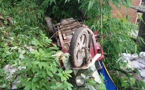6月16日14点左右,一辆三轮车在永川大南村斑竹湾倒车时栽到坡坡下边去了,三轮朝天,车上的东西洒落一地。