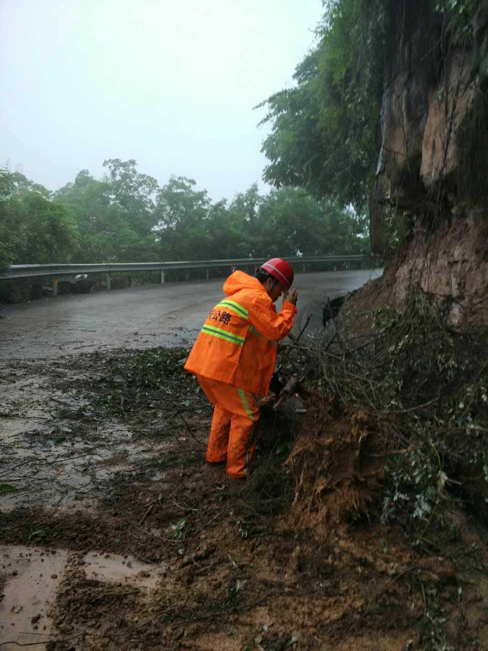 昨天下午,因遭受暴雨袭击,万州至柱山方向16.7公里处发生垮塌,垮方约600方,导致交通断道。区公路局养护一段干部职工立即赶赴现场,迅速设立警示标志,调集装载机,同时人工配合清理塌方,以最快的速度疏通交通。公路养护人员连夜奋战,凌晨2点左右,道路恢复正常通行。