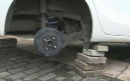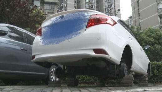 接警后,民警立即赶到现场调查,发现小轿车的四个轮胎都已盗走,车身下用几块砖头顶着。