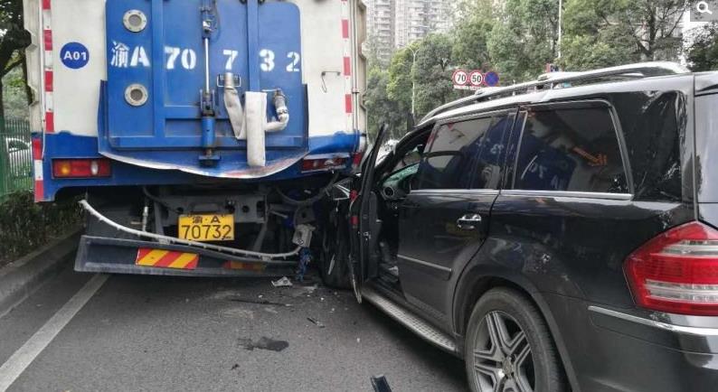 7月2日,在大渡口西城大道路段,一辆奔驰越野车因避让右侧车辆,一头撞向了一辆正在路边缓行作业的市政洒水车,导致奔驰车严重受损,洒水车的尾部也变形严重。当时市政洒水车正在以每小时5公里的时速在最左侧车道进行施工作业,突然一身巨响,车身一阵晃动,下车查看时发现,一辆奔驰车的半个车身直接陷入了洒水车的右侧尾部,导致水箱和后面的清扫设备变形被卡住,而奔驰车的车头也严重变形。据了解,奔驰车车主是一名年龄在六十岁左右的男性车主。