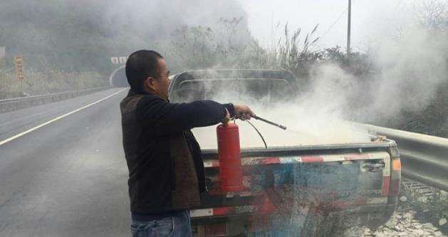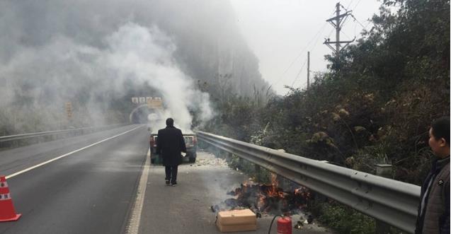 12月2日上午,重庆市交通行政执法总队高三支队三大队执法人员接到报警称,包茂高速清平段(黔江往重庆方向),有一皮卡车发生自燃,就在鱼泉隧道入口处,情况十分紧急。接到警情后,执法人员立即赶往现场。