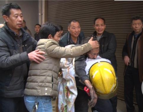 “厕所发现一个老人,快搭把手!”下午2点58分,淹没在浓烟深处的消防官兵在位于门口不远处的卫生间内,发现一位80岁左右的老人。此时老人的情况十分危急,已经处于半昏迷状态,右腿被玻璃划伤。两位消防官兵急忙将老人抬出火场,并送往医院。