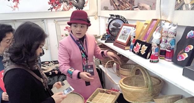 在綦江版画展台前,围满了年龄不一的女士们,吸引她们的是一个个特色的版画挎包。昔日只出现在纸上的綦江版画,在文化创意人员的手中,被印在了白色的布面上,成为了充满民族风的时尚饰物。