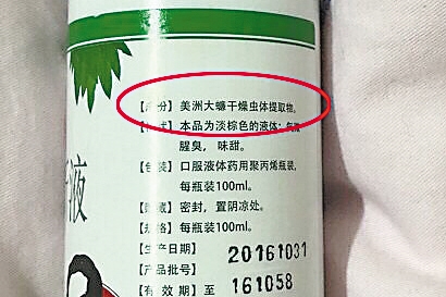 陈女士拍摄的照片显示,这是一瓶名为“康复新液”的药物,具备药物生产批准文号,生产日期为2016年10月,有效期至2018年。记者还注意到,成分的确写有“美洲大蠊干燥虫体提取物”字样,由四川一家医药公司生产。