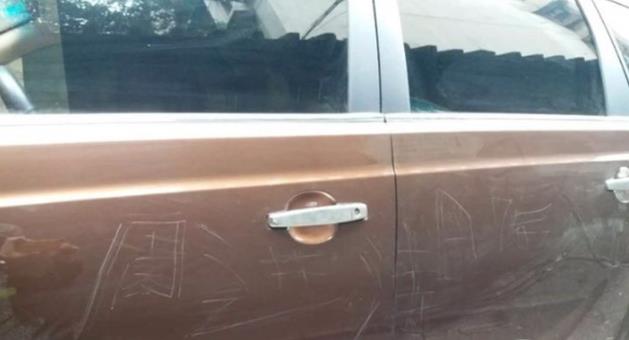 昨天中午11点过,沙坪坝110快处民警来到沙坪坝上桥煤研所附近,报警人刘先生的车就停在路边。刘先生说,他前一天下午将这辆车牌号为川M56C**的棕色面包车停在煤研所楼下,可昨天中午出门准备开车时发现车身左侧被人划坏,仔细一看,竟不是随意乱划,而是清晰地写着“周进涛回家”几个大字。