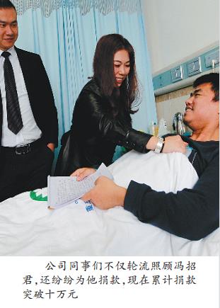目前,公司的同事们不仅轮流照顾冯招君,还纷纷为他捐款,现在累计捐款突破十万元。陈利兰说:“手术费要十几万元,我们还在为他想办法,希望他早点康复,也能早日实现和妈妈团聚的心愿。”