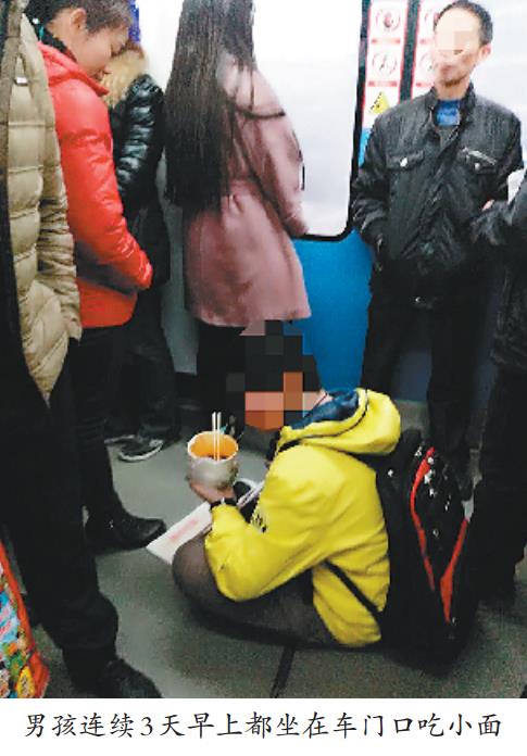 昨天早上7点40分,家住回兴的李女士从长福路站乘坐3号线前往园博园,前脚刚踏进车厢,后面就跟上来一个“熟悉的陌生人”——一名10岁左右的男孩端着一碗热气腾腾的小面,径直走进第一节车厢,对着门边的乘客喊到:“站开点,我要坐下来。”话一出口,周围的人都看了他一眼,发现是一名小学生,于是大人们纷纷靠边挤了挤。此时这位“霸气”的男孩顺势坐到车厢地板上,拿出报纸垫在地上,然后心安理得地吃起小面。