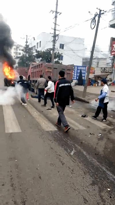 小车连撞两车燃起熊熊大火 近十人救出昏迷驾驶员