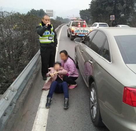 2月17日下午18点34分,执法队员由G85收费站向中梁山隧道方向巡逻,当巡逻至白市驿立交附近时,一辆牌照为渝CMM366的银灰色奥迪轿车停在超车道,一中年妇躺在车旁,气息十分微弱,全身抽搐不止,脸色十分苍白,一年迈的老太太扶着她正焦急的四处求救。