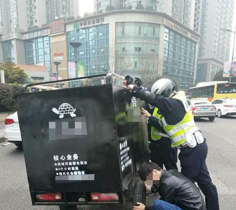 2月18日下午4点,江北交巡警支队观音桥大队民警在观音桥环道巡逻时,发现前方一辆行驶中的快递三轮电动车右后车轮异常,轮毂往外凸出,车轮即将飞出车外。