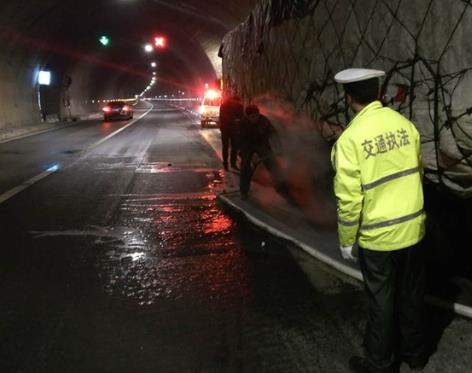直到巡逻车靠近时,驾驶员仍然浑然不知,执法人员立即利用喊话器向驾驶员喊话,发现情况后,驾驶员立即在附近的正阳隧道应急停车港内停了下来。