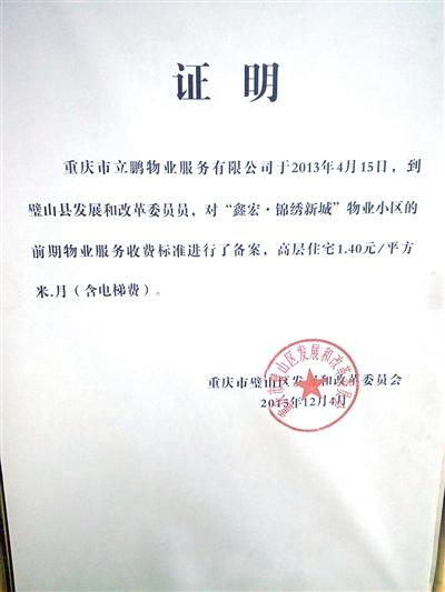 对此,该小区物业的负责人屈经理表示,物业公司在2013年4月到璧山区发展和改革委员会对前期物业服务费收费标准进行了备案,高层住宅1.4元/平方米·月(含电梯费)。