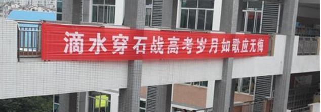 重庆秀山中学V字型的教学楼,4层楼拉起了8条标语,看上去十分壮观。“快马加鞭君为先,自古英雄出少年”、“十年寒窗百日苦练何人健步登金榜,一腔热血万丈豪情我辈英才夺桂冠”、“全力以赴用勤奋改变人生,永不言败以执着成就未来”、“挥洒斗志书无悔青春,挑战极限圆人生梦想”……