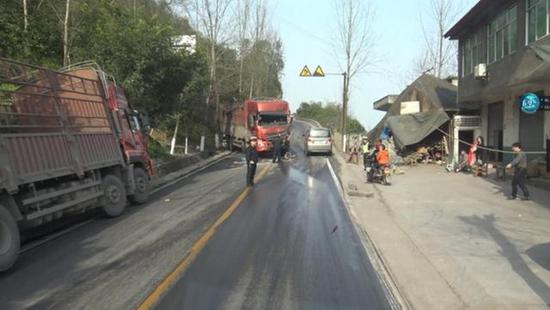 事发路段处于拐弯上下坡处,上坡方向货车内有一名男驾驶员和一名女士,下坡方向有一名男驾驶员。两辆货车迎面相撞后,在撞击瞬间,两车被反弹开10米远,两车均不同程度受损,其中往下坡方向的驾驶员左腿腿部被卡,两边车门也严重变形,无法打开。