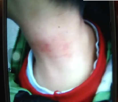 小杰今年5岁,是合川“希望幼儿园”大班的孩子,小杰的奶奶车阿姨说,3月15号孩子一回家就嚷着说脖子痛,她翻开衣领一看,孩子的脖子有一大块红斑,小杰说,他是被幼儿园的老师掐的。