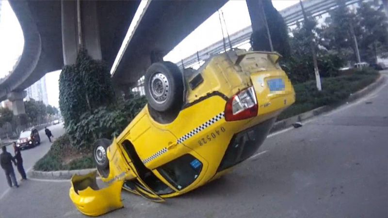据了解,事发时出租车从大渡口方向往毛线沟方向正常直行,与前方一辆调头轿车发生碰撞,由于惯性加上出租车驾驶员猛打方向,最终导致出租车在地上翻滚几圈后才造成现在的场景。