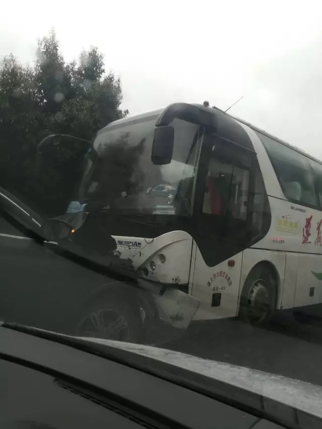 小车对直撞向大巴 车头都陷进去了