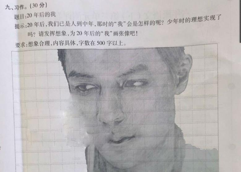 据了解,这是万州某小学6年级进行的一次语文考试,在这道题目为“20年后的我”的作文题中,命题要求“20年后,我们已是人到中年,那是的我会上怎样的呢?请发挥想象,为20年后的我画张像吧”;要求想象合理,内容具体,字数在500字以上。记者看到,不少同学都认认真真的书写了对于自己20年后的想象,只有一位“奇葩”的小学生,竟在考卷上用铅笔画了一张吴彦祖的画像!你别说,画功还相当不错……