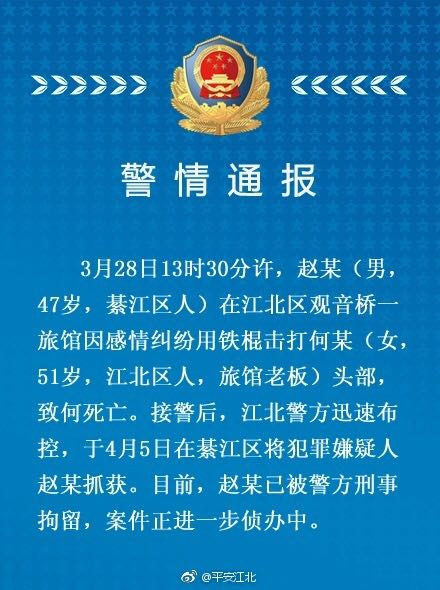 4月6日上午,江北区公安分局官方微博发布警情通报,3月28日13时30分许,赵某(男,47岁,綦江区人)在江北区观音桥一旅馆因感情纠纷用铁棍击打何某(女,51岁,江北区人,旅馆老板)头部,致何死亡。接警后,江北警方迅速布控,于4月5日在綦江区将犯罪嫌疑人赵某抓获。目前,赵某已被警方刑事拘留,案件正进一步侦办中。