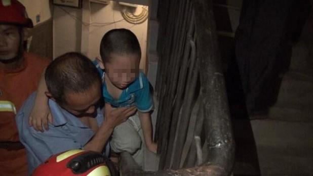 消防官兵来到事发地后,发现小男孩身体悬空,左腿膝盖紧紧卡在铁扶手,痛得嚎嚎大哭,家长一直轻声安慰,周围邻居焦急等待着消防官兵。