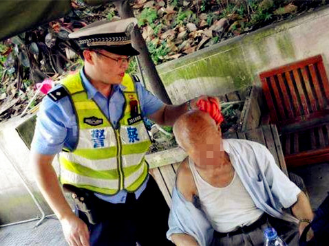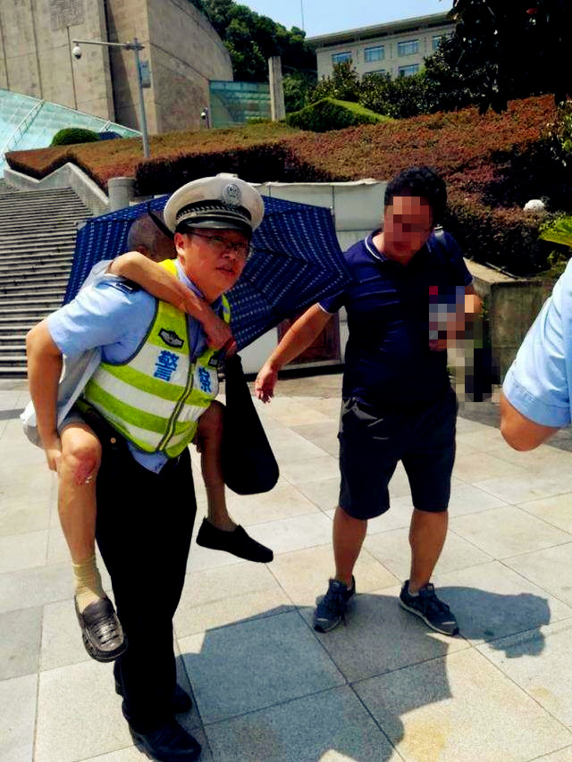 接到报警后,渝中交巡警支队大礼堂大队民警赶到现场,发现老人是中暑了,且已接近昏迷,言语不清,手和腿上也都有局部烫伤。