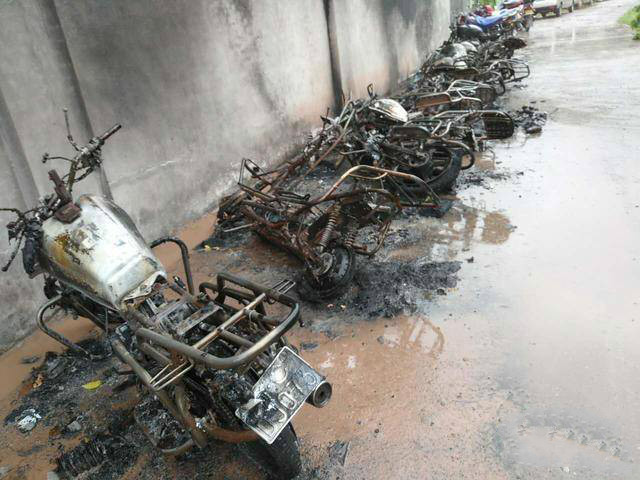 在一个廉租房小区的围墙外,我们看见停靠着一排被烧焦的摩托车、电瓶车。经过计算,共有11辆车被火烧毁。