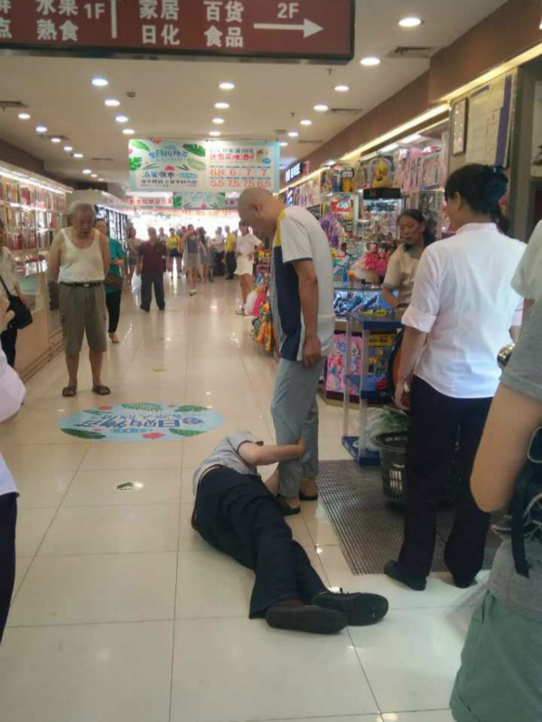 8月17日早上,重庆渝北加州一超市的市民来来往往,而超市的一名保安却倒在地上紧紧地抓住一名男子的裤脚。
