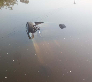 司机开车玩手机 小车仰翻沉入水里