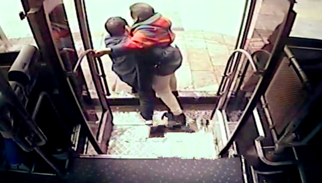 老人下车遇尴尬 公交车司机温暖一抱获点赞