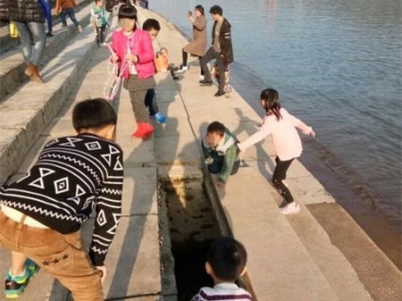 江边的梯子上,好多小孩在旁边来来往往的玩耍。在冬日暖阳的照耀下,孩子们玩得十分兴奋。甚至有的小孩将脑袋伸进大洞里观看,大人们在江边拍照,并未有人制止。