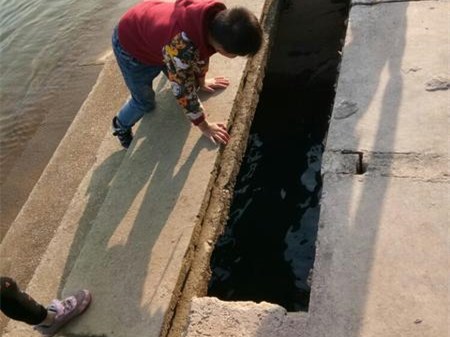 江边步梯露出大洞 一众小孩却在周围玩耍很危险