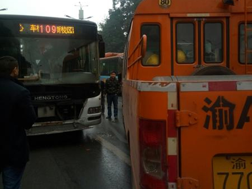 1月3日,永川金港明珠站,一公交车和电力公司的车相撞,车头损毁严重。