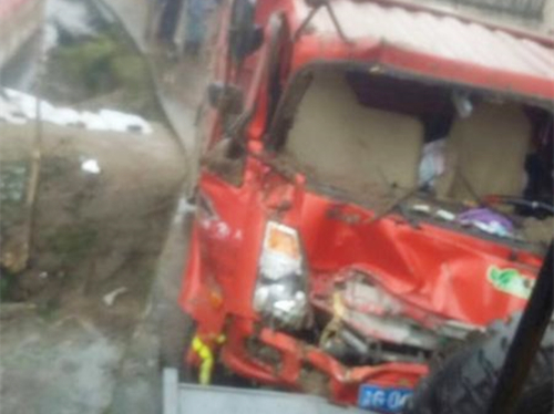 被救起后,货车车头面目全非,车窗玻璃散落一地。