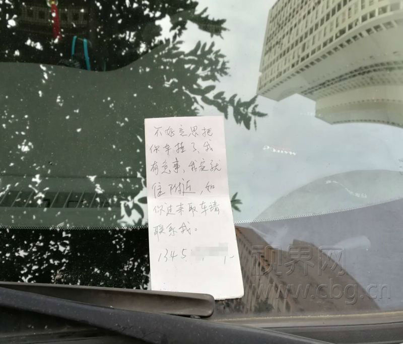 正当他准备开车离开,突然发现挡风玻璃上贴了张字条,郑先生伏下身子一看,上面赫然写着几行大字,“不好意思把你车挂了,我有急事,我家就住附近,如你过来取车请联系我”,并附上了电话号码。