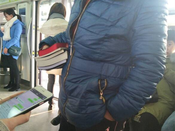 这位乘客穿着黑色运动鞋搭配黑色运动裤,上身穿着一件深蓝色棉衣,一只手插在裤兜里保暖,一只手托着几本书,像一位资深的教师一样,在车厢里开始讲课。