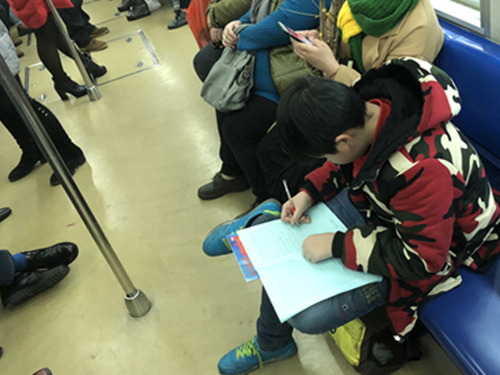 霸气!小学生翘着二郎腿 在车厢内奋笔疾书