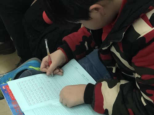 唯独有一个小男孩特立独行,引起了胡先生的注意。这个小男孩约十岁左右,一头清爽利落的短发,穿着红色系的迷彩外套,书包放在地上,坐在座椅上,正在奋笔疾书的做作业。