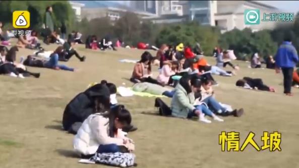 梨视频消息,1月10日,阳光充盈,重庆师范大学大学城校区的情人坡上,许多同学扎堆坐在草坪上,一边享受阳光的沐浴一边复习。更有网友感慨道:这简直就是大型“屠狗”现场,还让不让“单身狗”好好学习了?