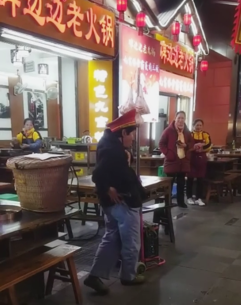 一位穿着宽松,戴着红色帽子,看起来约四十来岁的大叔,在火锅店门口大展舞姿,跳起了曾经红遍大江南北的神曲《江南style》,顿时嗨翻全场。